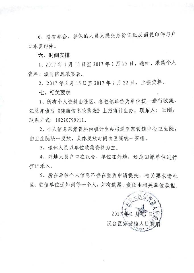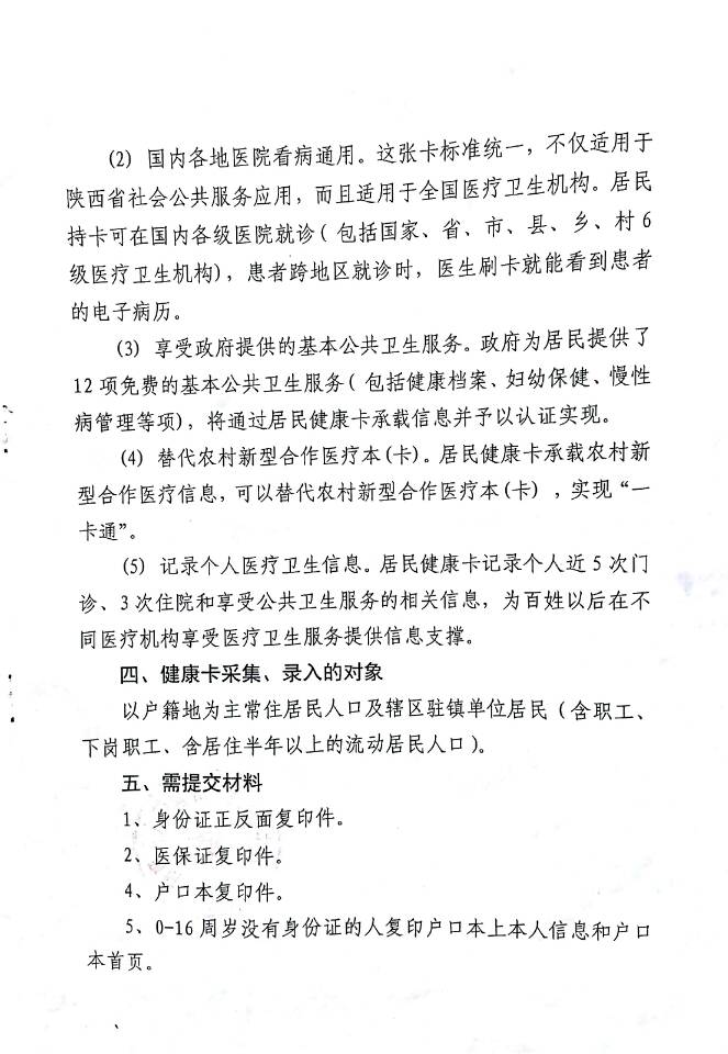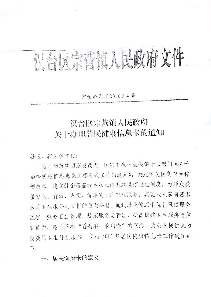 为贯彻落实国家发改委、国家计生委建立健全覆盖城乡居民的基本医疗卫生制度,整合卫生资源,规范服务与管理,提高医疗卫生服务与监管能力,逐步解决“看病难、看病慢”的问题,为公众提供更为便捷的卫生计生服务。根据《汉台区宗营镇人民政府关于办理居民健康信息卡的通知》(宗镇政发[2016]4号)文件精神,现将我院2017年居民健康信息卡采集工作通知如下: